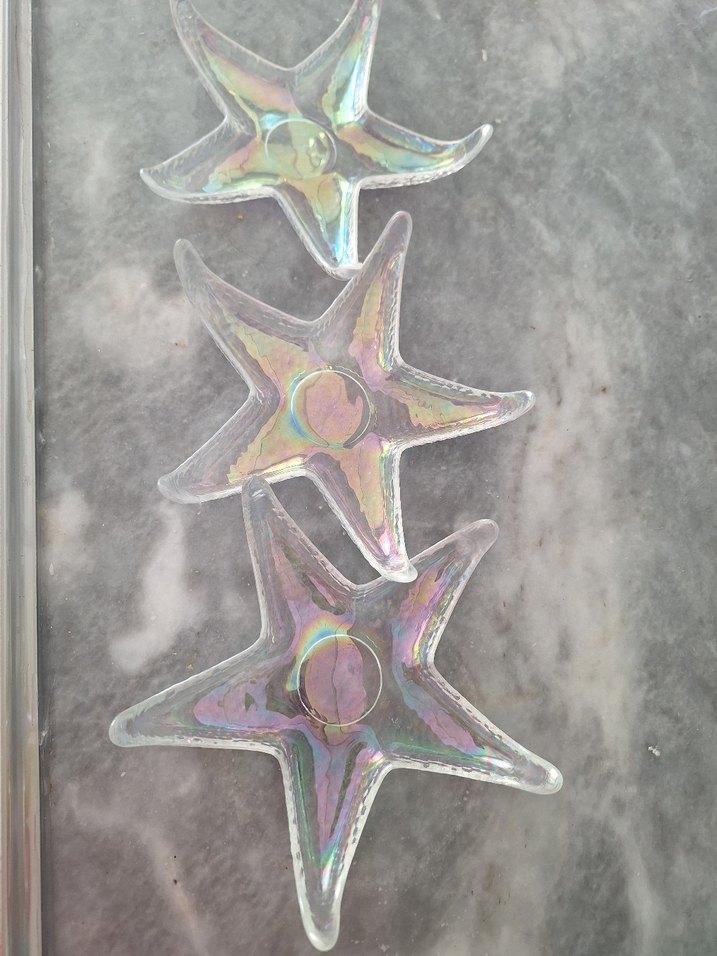 Şeffaf, renkli ve tie-dye desenli yıldız şeklinde broşlar. Bohem ve retro tarzlara uygun, parti için ideal canlı aksesuarlar.