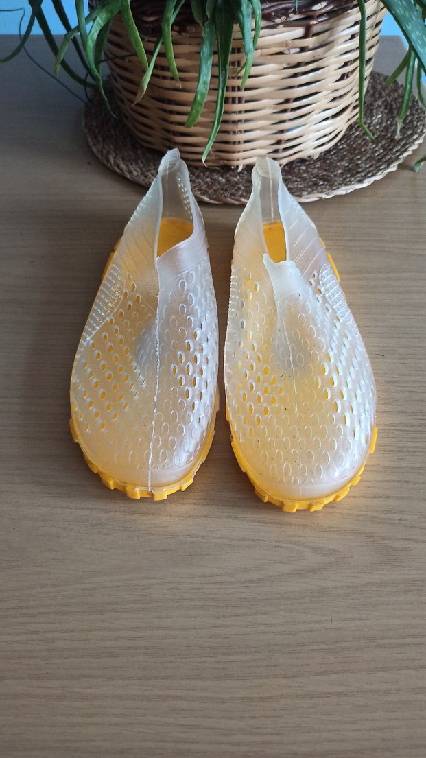 Şeffaf ve sarı tabanlı erkek su ayakkabısı, kauçuk malzemeden. Minimalist ve bohem tarzda, günlük ve modern moda için uygundur. 38 numara novelido marka. 2 defa giyildi.