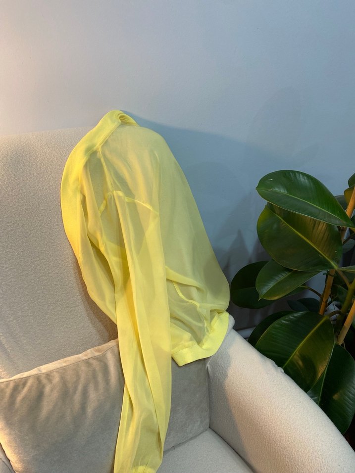 Şeffaf sentetik kumaştan yapılmış, yüksek yakalı ve uzun kollu sarı kadın bluz. Gevşek kesimi ve gündelik kullanım için uygun avant-garde tarzda.