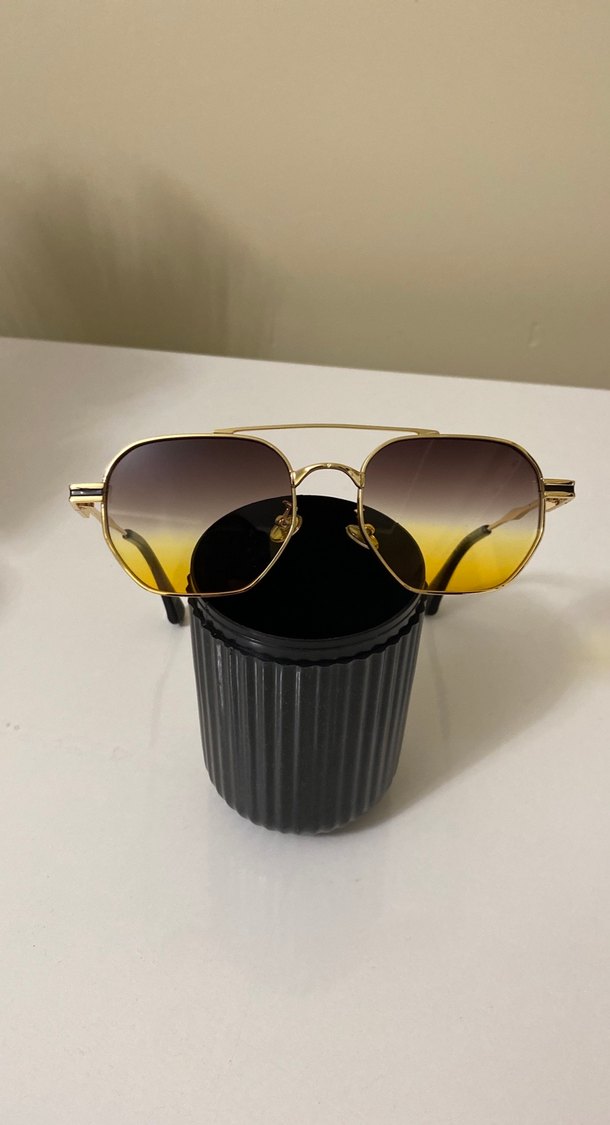 Kadınlar için şeffaf çerçeveli, koyu sarı degrade renkli, minimalist ve karşı kültür tarzında gözlükler. Klasik zarafet sunar.️