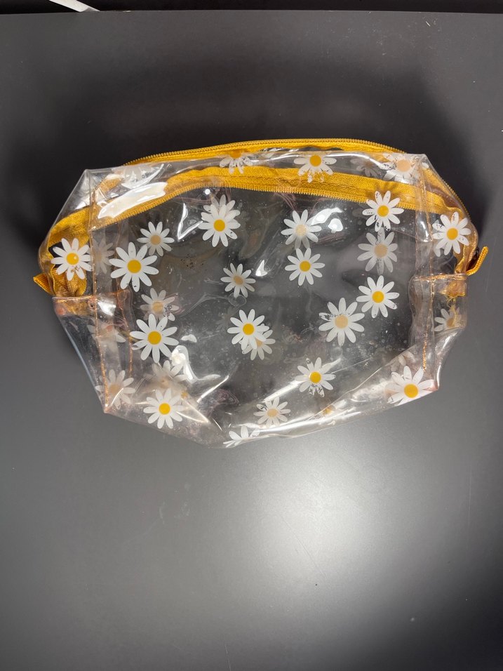 Şeffaf malzemeden yapılmış, sarı fermuarlı ve renkli papatya desenli makyaj çantası. Günlük kullanım için uygun, minimalist ve bohem tarzı yansıtır.