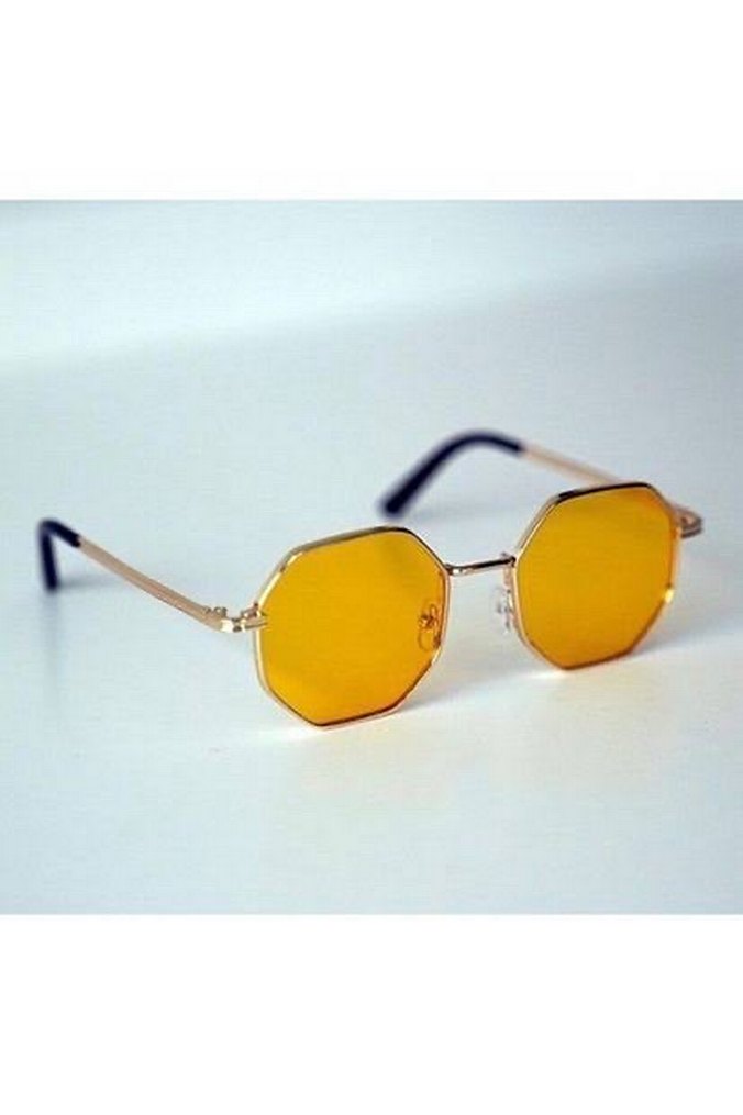 Kadınlar için şeffaf, renkli sarı lenslere sahip, retro sekizgen şekilli güneş gözlüğü. Bohem ve hippie tarzına uygundur. Kutusu vardır