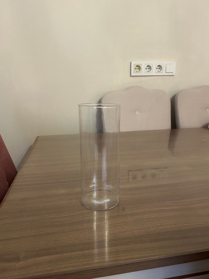 Çiçek veya dekoratif objeler için uygun, sade ve şeffaf silindir şeklinde cam vazo.