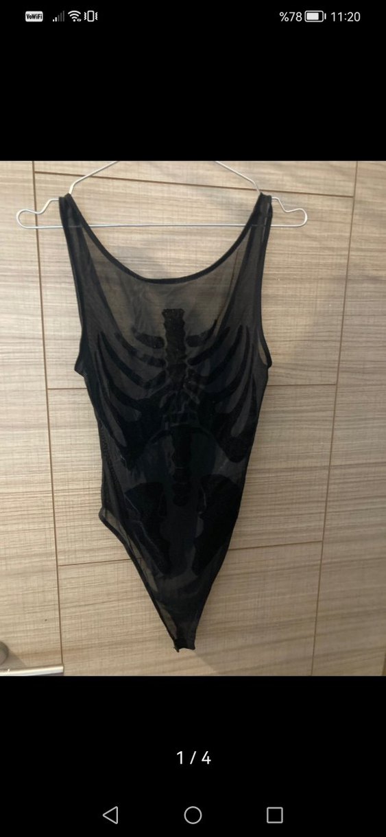 Kolsuz, vücuda oturan midi boy mayo, şeffaf kumaş ve gotik iskelet desenli, parti için uygun.