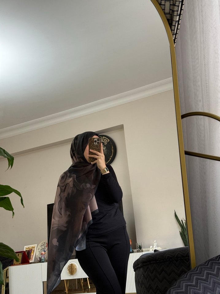 Şeffaf ve saten dokulu siyah kadın şalı, mütevazı ve sokak tarzı görünüm sunar. Katmanlama için uygundur.