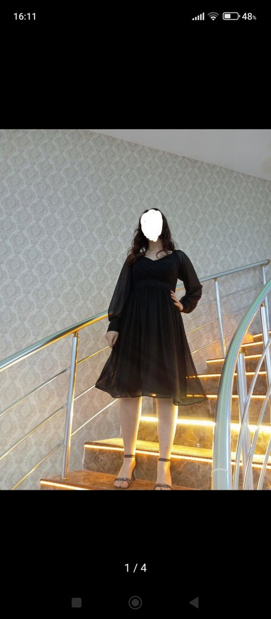 Şeffaf uzun kollu, V yaka, siyah midi elbise. Bol kesim ve gotik tarzıyla dikkat çeker. Sentetik kumaştan üretilmiştir. mezuniyet ve düğün için bire bir. mezuniyetim için almıştım. 2 kere 3.4 saatliğine giydim. hiçbir defosu falan yok. alındığı gibi.