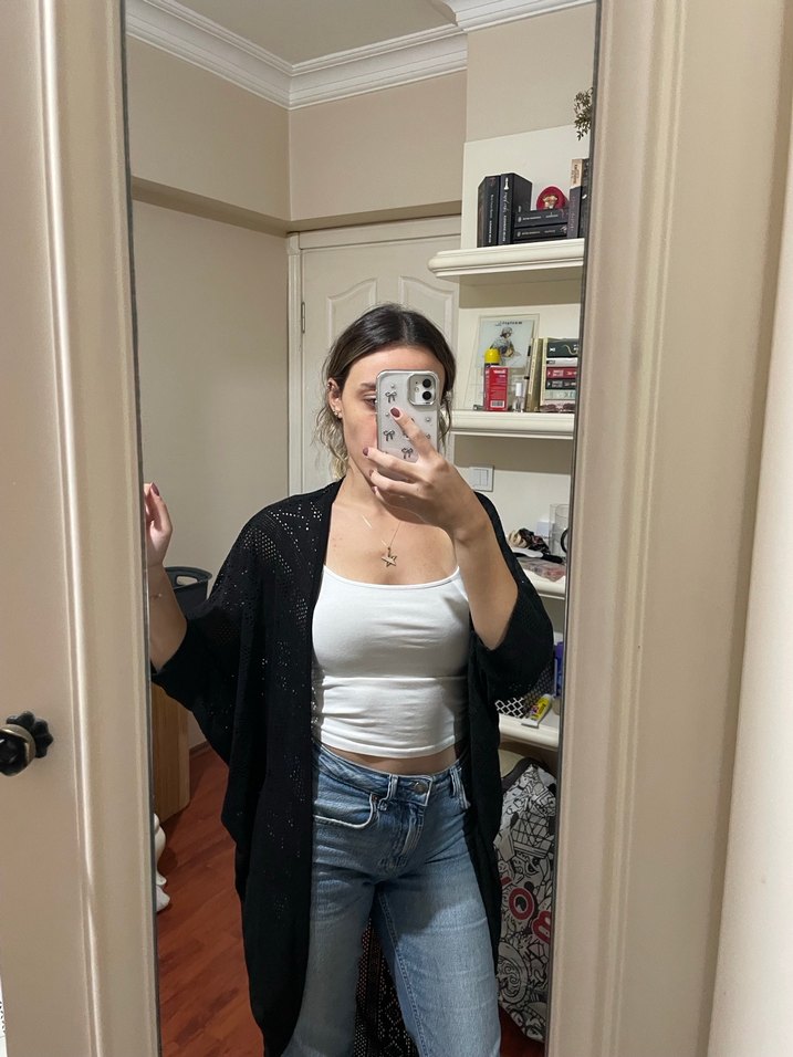 Siyah midi boy, uzun kollu, şeffaf kumaştan, bol kesim kadın hırkası. Günlük kullanıma uygun, desen içermeyen rahat bir tasarım. Bir kere kullanıldı, sağlam ve defosuz.
