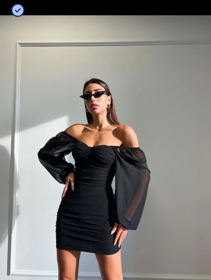 şeffaf strappy kollu siyah mini elbise. Fitted kesimi ve asil tarzı romantik akşamlar için güzel bir seçimdir.