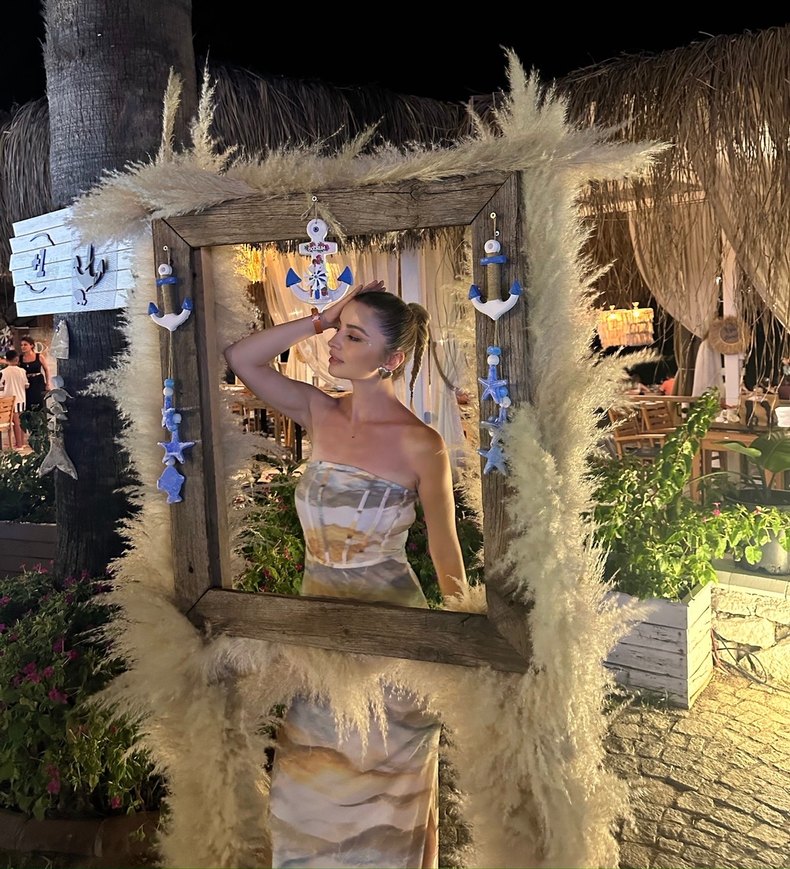 Şeffaf tasarımlı, straplez ve strappy kollu bustiyer. Açık bej tie-dye deseni ve mini boyuyla bohem ve avangart tarzda, parti için uygun.