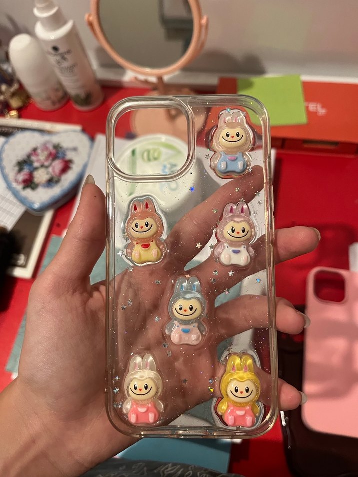 Pastel renkte, parlak yüzeye sahip ve pop kültür figürleriyle süslenmiş çok renkli telefon kılıfı.