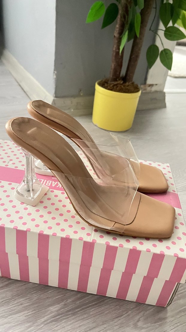 Bej renkte, şeffaf bantlı ve ince topuklu kauçuk tabanlı kadın terlik. Günlük kullanıma uygun, çağdaş ve Paris tarzı bir tasarım.