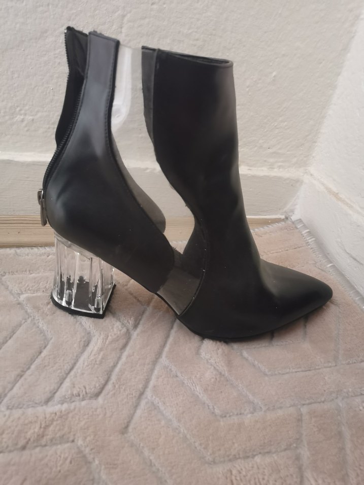 Şeffaf Topuklu Siyah Deri Kadın Bot