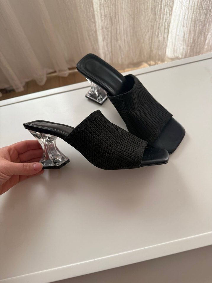 Bir kaç kere kullanıldı temiz yeni alınmış gibi tabanından bellı oluyor siyah renkte, şeffaf topuklu ve tokalı detaylı kadın terlikleri. Kauçuk malzemeden yapılmış, minimal ve çağdaş tasarım sunar.