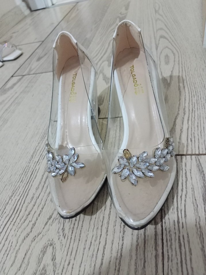 Şeffaf ve beyaz, topuklu abiye ayakkabısı, taşlı süslemelidir. Rahat kauçuk malzemeden üretilmiştir. Nikahımda bir kere giyindim üzerinde ki taşlarda düşme var ekledim. 38 numara.
