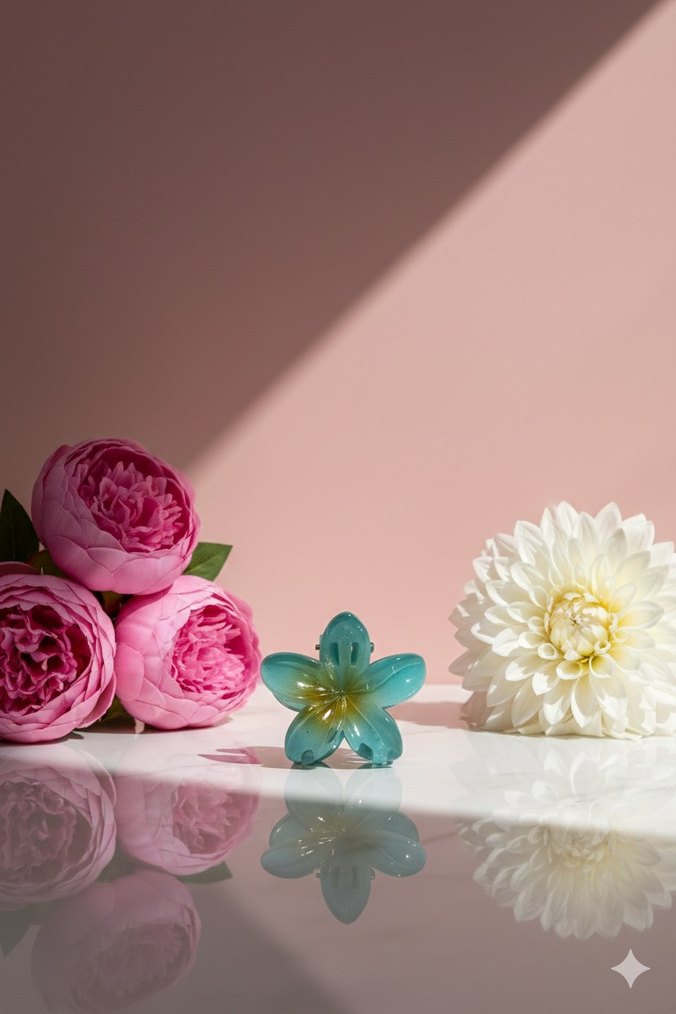 Şeffaf turkuaz camdan yapılmış çiçek şeklinde saç tokası. Minimalist ve bohem tarzlara uyum sağlar, retro ve renkli bir dokunuş katar.