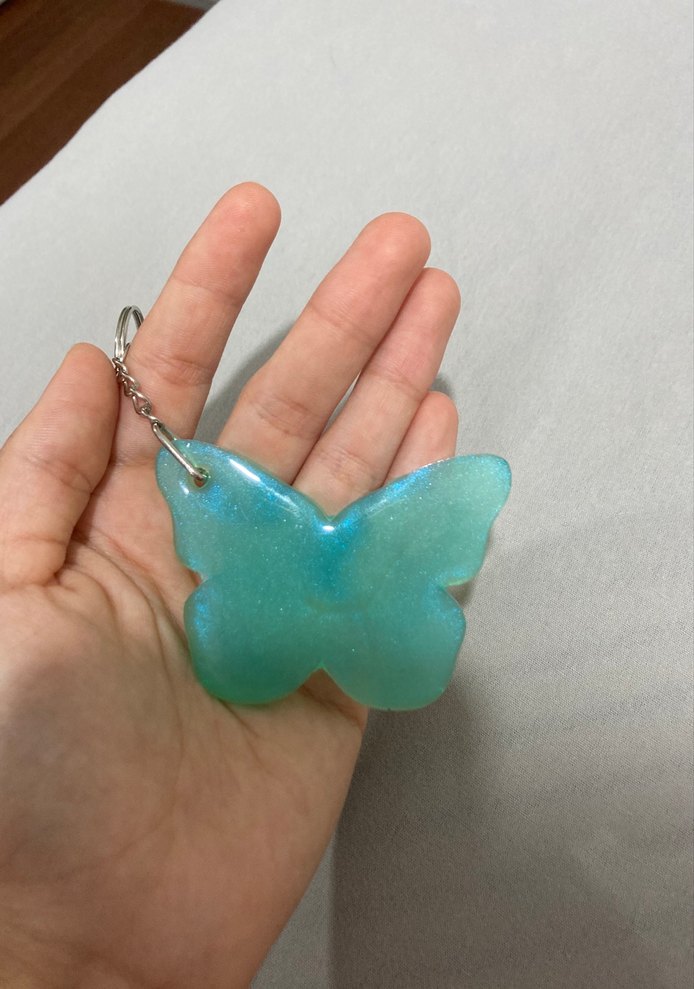 Şeffaf pastel turkuaz renkte kelebek şeklinde, minimalist bohem tarzını yansıtan anahtarlık.