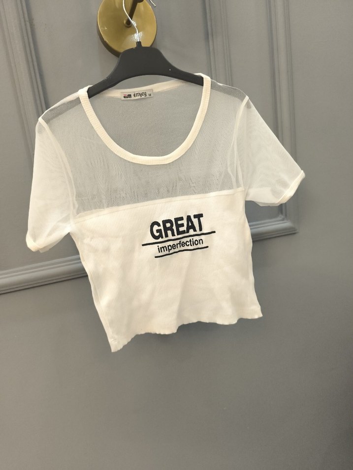 Pamuk kumaştan, kısa kollu, şeffaf üst kısmı ve baskılı 'GREAT imperfection' yazısı olan beyaz, dar kesim kadın tişörtü. Spor ve sokak stili için uygundur. ♀️