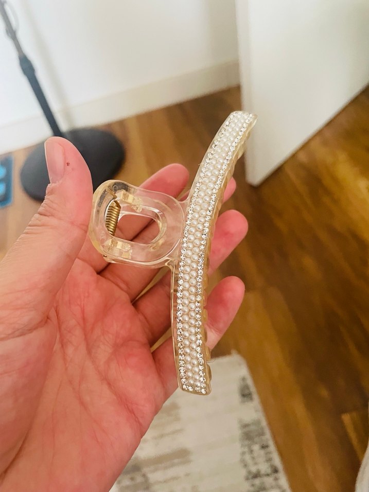 Işıltılı inci detaylı, altın renkli plastik tokalı saç aksesuarı, çağdaş ve Paris tarzında klasik zarafet sunar.