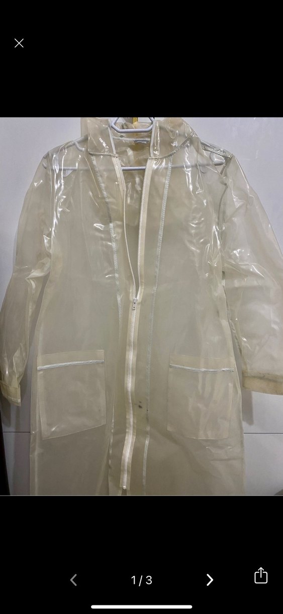 Şeffaf plastikten yapılmış, uzun ve vücuda oturan kadın yağmurluğu, keskin yakalı ve askılı kollu, minimalist sokak stili için uygundur. Önünde iki cep ve fermuar bulunur. ☔