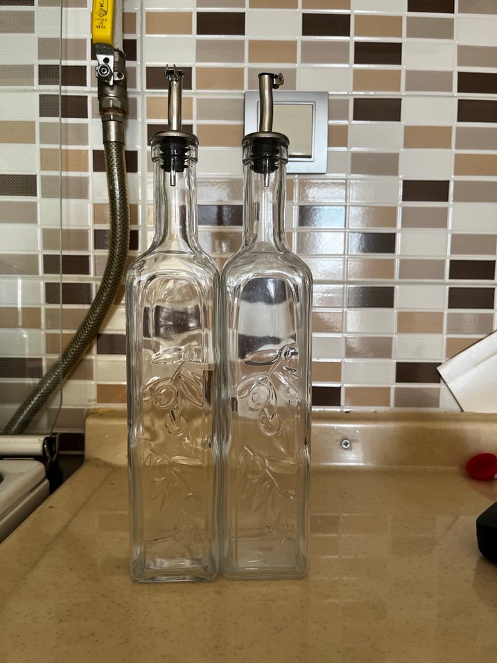 Şeffaf camdan yapılmış, zeytin dalı desenli yağ ve sirke şişeleri, dökme ağızlıkları ile kullanıma hazır.