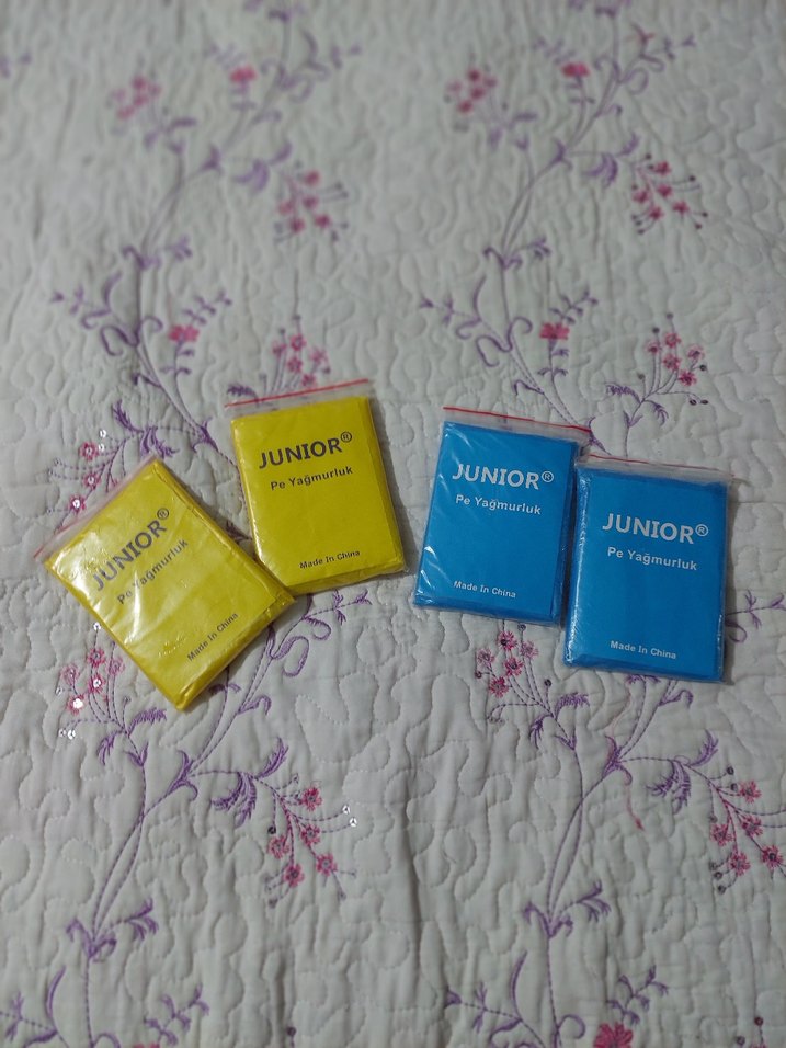 Yeni ambalajında. 4 adet, 38/44 bedene kadar uyumlu. ceket, palto üzerine anı yağmurlarda çanta da bulunması için, tekrar tekrar kullanılabilinir, bir yere takılıp yırtılmadığı sürece.2 mavi, 2 sarı renk 4 adet.