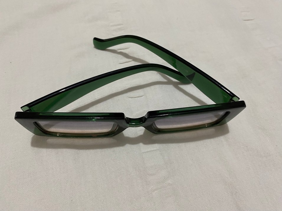 Koyu yeşil, şeffaf çerçeveli kadın gözlüğü, minimalist ve çağdaş tasarıma sahip, sade ve temel tarzda.