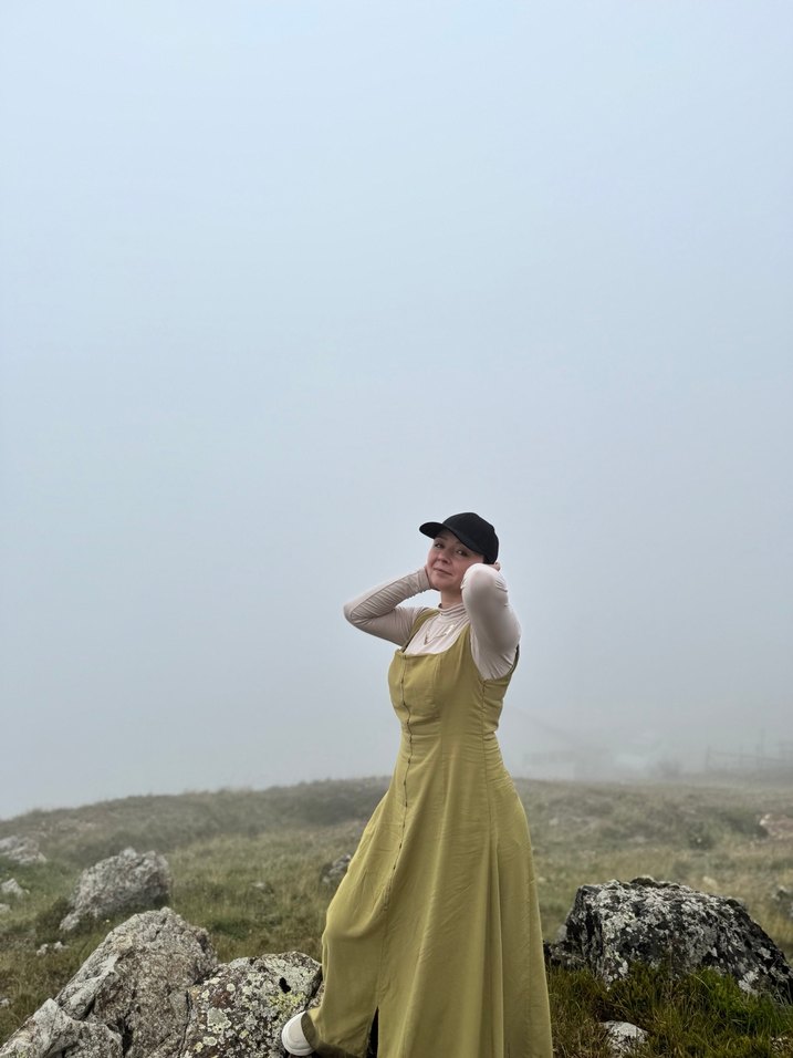 Şeffaf detaylı, yüksek yakalı ve kolsuz olan bu haki midi elbise, rahat kesimi ve yumuşak sentetik kumaşıyla dış mekan kullanımı için uygundur.
