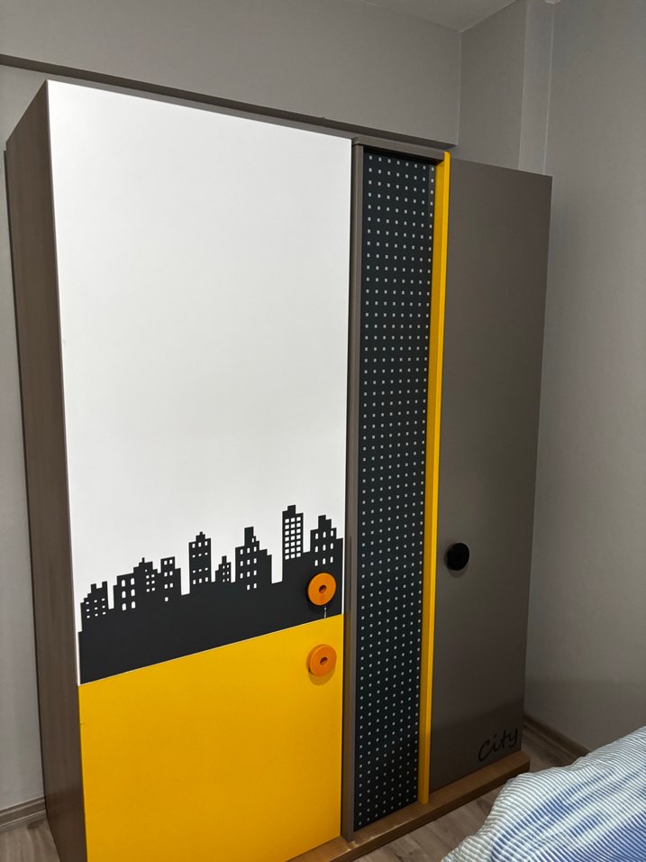 Şehir Desenli Sarı Gri Çocuk-Genç Gardırop MDF