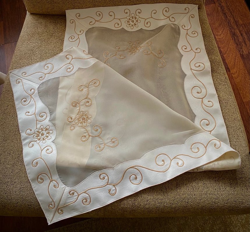 Organze 2 adet 40*98 cm 2 adet 49*40 cm Toplam 4 adet Uzun olanlardan birinde sadece alttan görünen yanık izi var, üstten görünmüyor.