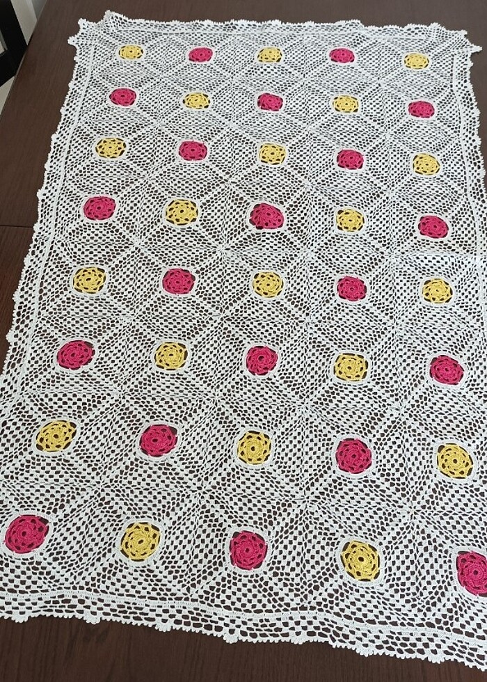 Beyaz floş iple ve renkli motiflerle örülmüş sehpa örtüsü. En 55 , boy 55 cm. Kullanılmamıştır.