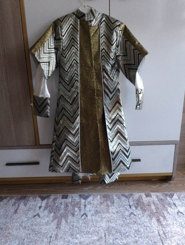 Çocuklar için drapeli, desenli gri ve altın renkli kumaştan yapılmış takım. Notlu yaka, uzun kollu ve regular fit bohem tarzda.