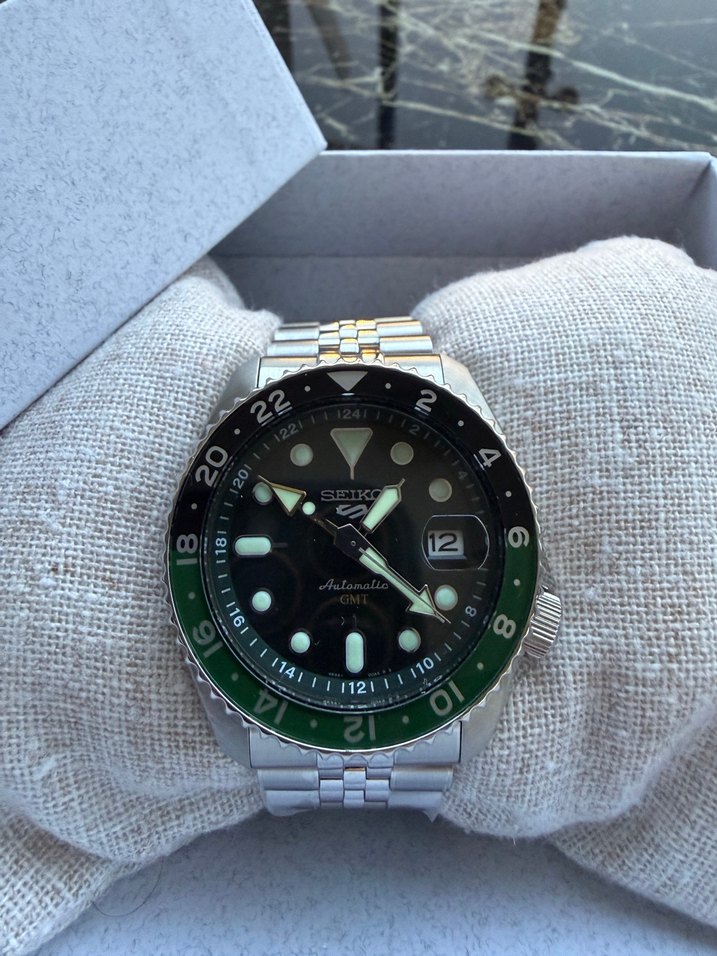 Ürün yetkili bayii Aydın saat çıkışlı olup 7 Ocak 2029 yılına kadar garantisi mevcuttur. Özellikleri kalibre 4R34 otomatik mekanizma lensli hardlex cam çap lumibrite ibre ve indeksler 24 saat çift zaman fonksiyonu tarih göstergesi çap 42mm kasa yüksekliği 13.6mm kasa uzunluğu 46mm manyetik direnç 4800 A/m ağırlık 159 gram güç rezerv 41 saat su geçirmezlik 10 ATM transparan arka kapak paslanmaz çelik kasa ve çelik kordon.Bilekte çok şık duran Seiko Automatic GMT serisinin en çok tutulan modeli olup sadece 1 defa bilek görmüş sıfır ayarındadır alana hayırlı olsun.