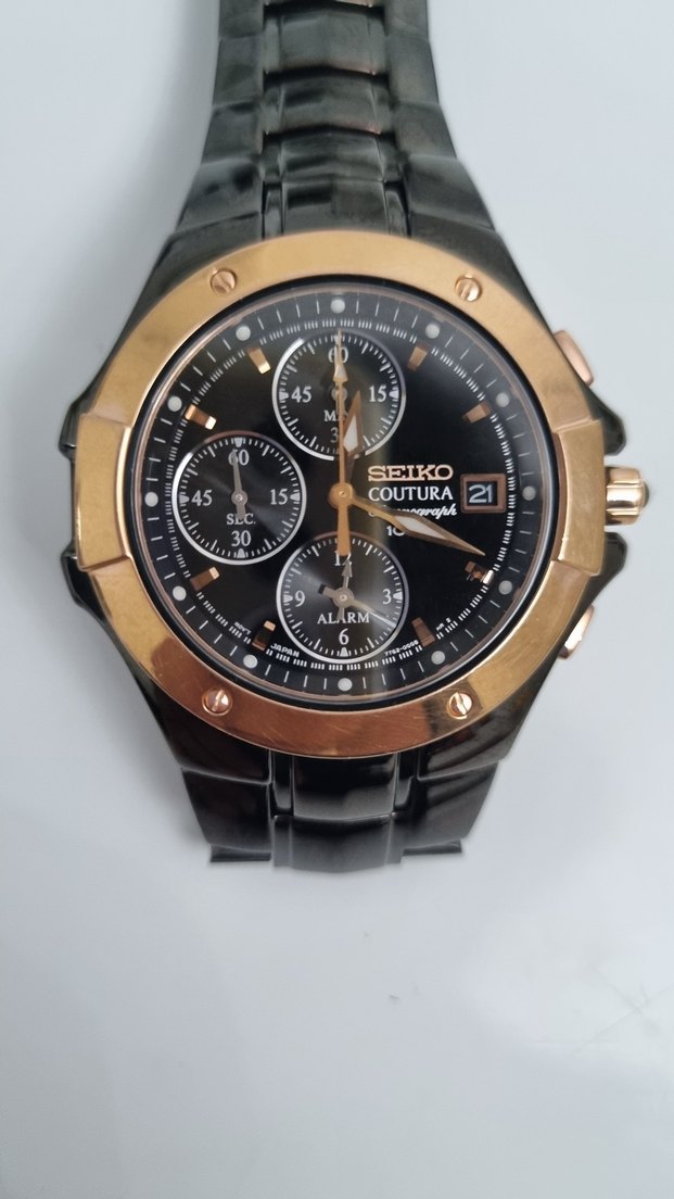 .Seiko Coutura erkek saati, koyu renk kayış ve altın renk çerçeveye sahip. Kronograf özellikli ve 100 metre su geçirmez. ⌚