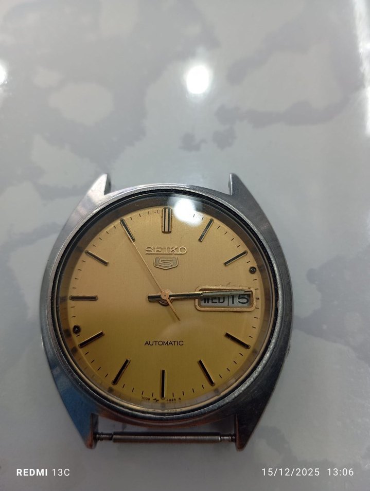Seiko erkek saati, parlak bej kadran, otomatik mekanizma ve gün-tarih göstergesi ile klasik ve karşı kültür tarzını birleştirir. ⌚