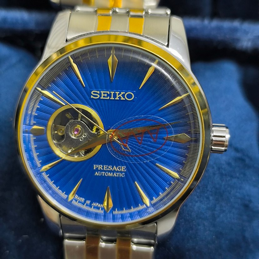 Seiko Presage otomatik erkek saati, renkli mavi kadran ve altın detaylarla klasik tarzı hassas işçilikle buluşturuyor. ⌚AAA KALİTE kinetik enerji yani hareket ile çalışır aynı zamanda kurmalı olarak ta çalışır çelik kasa solmaz kararmazdir birinci kalite dır su geçirmez transparan arka kapak otomatik tır
