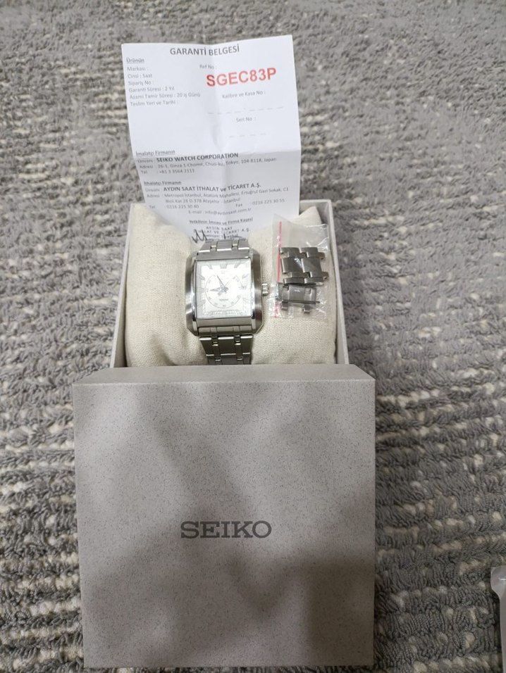 Seiko SGEC83P erkek saati, gri metal kayış ve toka detaylı, beyaz dikdörtgen kadranıyla klasik ve şık bir görünüm sunar. ⌚