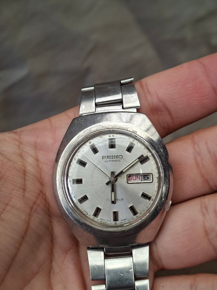 Seiko marka, gri ve bej tonlarında vintage erkek kol saati. Metal kayışlı, otomatik mekanizmalı ve gün-tarih göstergesi 'SUN 5' olarak ayarlı. ⌚ 6109 Ozel kalibre Seiko 5 değildir Seiko otomatiktir Koleksiyonluk Sağlam çalışır durumda
