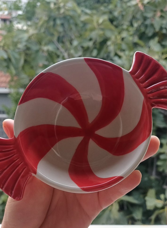 Kırmızı ve beyaz sarmal desenli, şeker şeklinde seramik kase. Küçük atıştırmalıklar veya dekoratif kullanım için uygundur. SIFIR KUTULU ÜRÜN.