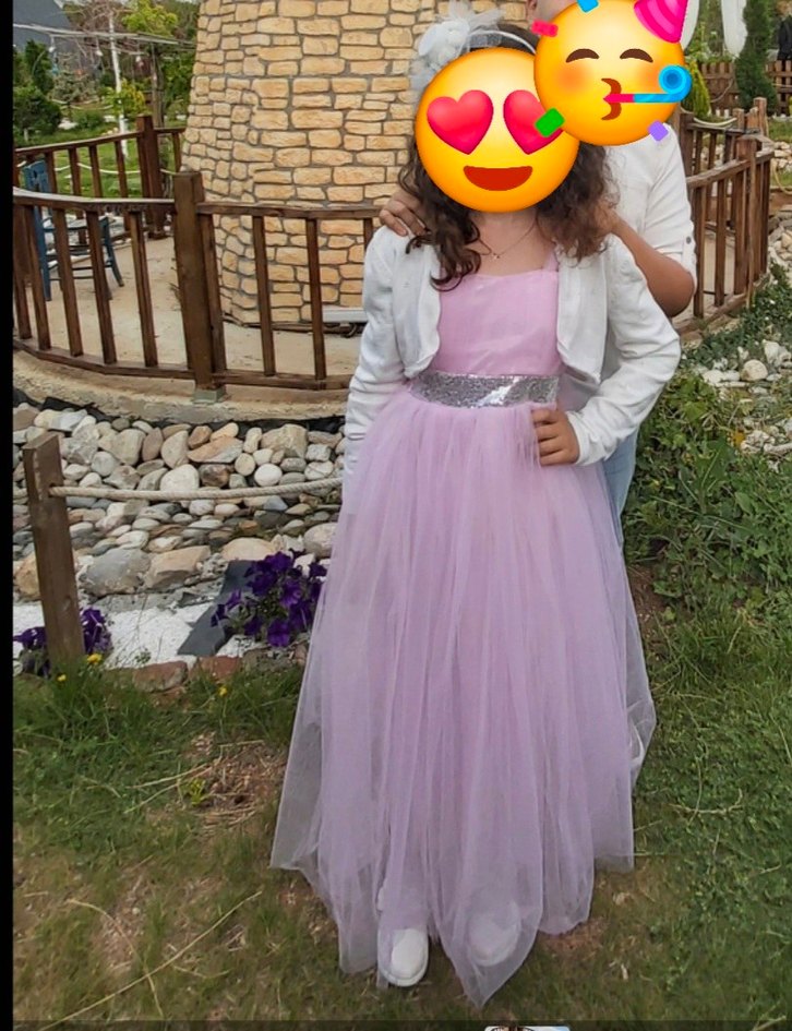 Şeker pembe renkli tüllü askılı 9-10 yaş uyumlu abiye elbise İki kez giyildi çok temiz. Boyu 110 cm eni 30 cm. Astarlı çok güzel elbise pamuk şeker pembesi beli nde pullar var sağlam. Beyaz renk bolerosu hediye edilecektir.