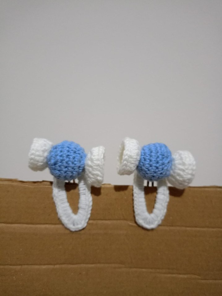 Pastel mavi ve beyaz renklerde, örgü malzemeden yapılmış, sade ve temel tasarımlı iki çocuk saç tokası seti.