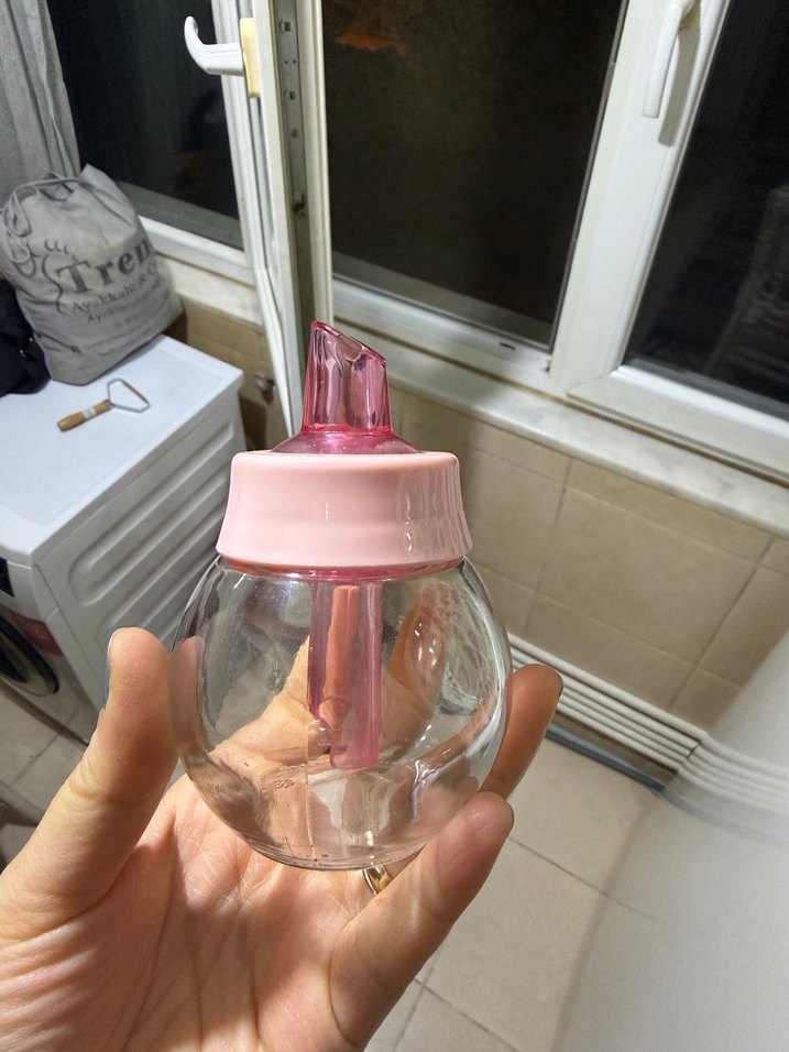 Pastel pembe kapaklı, şeffaf gövdeli ve yumuşak emziği olan bebek biberonu. Rahat kullanım ve kolay tutuş sağlar.