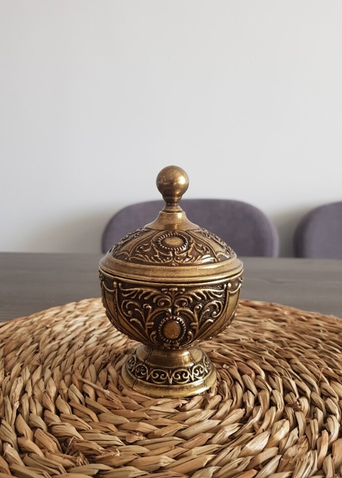 Arsal marka Bakır Zamak Dekoratif şekerlik.Hem mutfakta şekerlik hem de dekorasyon için kullanabileceğiniz bir ürün.Boyut : 13×11 cm