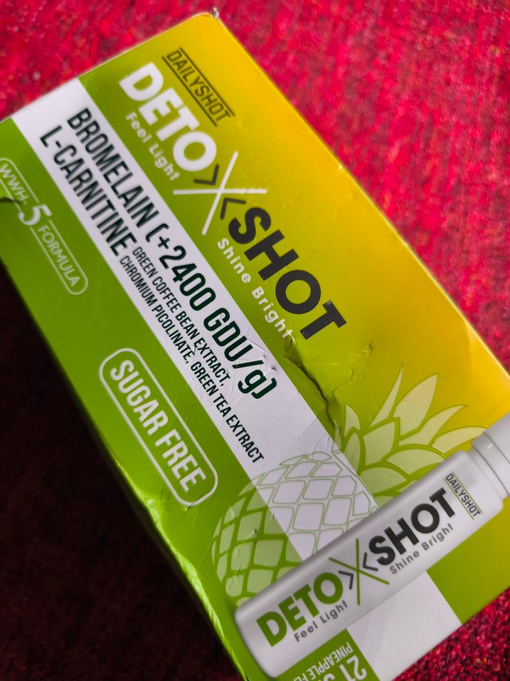 DETOXSHOT, bromelain, L-karnitin, yeşil kahve, yeşil çay ve krom içeren şekersiz bir detoks ve metabolizma destek takviyesidir. İçinde 18 adet var.