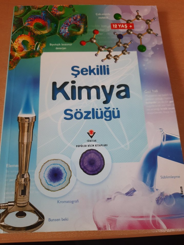 12 yaş ve üzeri için şekilli kimya sözlüğü, kromatografi, süblimleşme ve bunsen beki gibi terimler görsellerle açıklanmıştır.