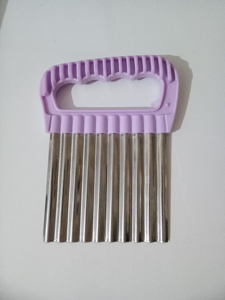 Mor pastel renkli, rahat tutuşlu ve metal dişlere sahip bıçak tutucu.