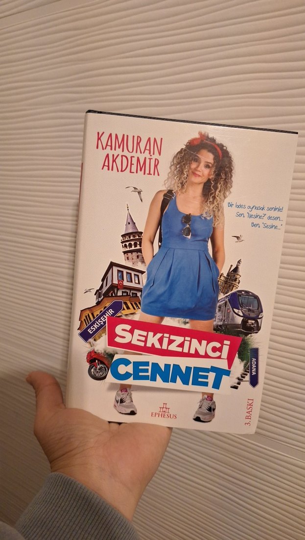 Kamuran Akdemir'in Sekizinci Cennet adlı romanı, kapakta genç bir kadın ve şehir öğeleriyle dikkat çekiyor. poster ve ayrac mevcut ciltli kapak