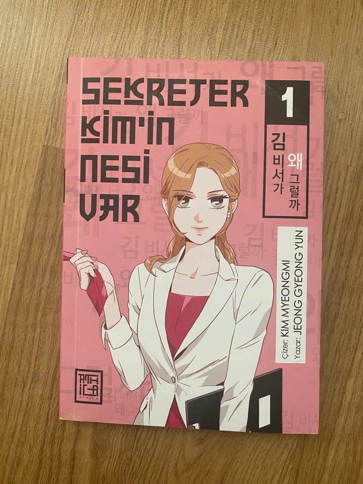Sekreter Kim'in Nesi Var adlı çizgi romanın 1. cildi, beyaz blazer ve kırmızı üst giymiş bir kadın karakteri kalem ve dosya tutarken gösteriyor.