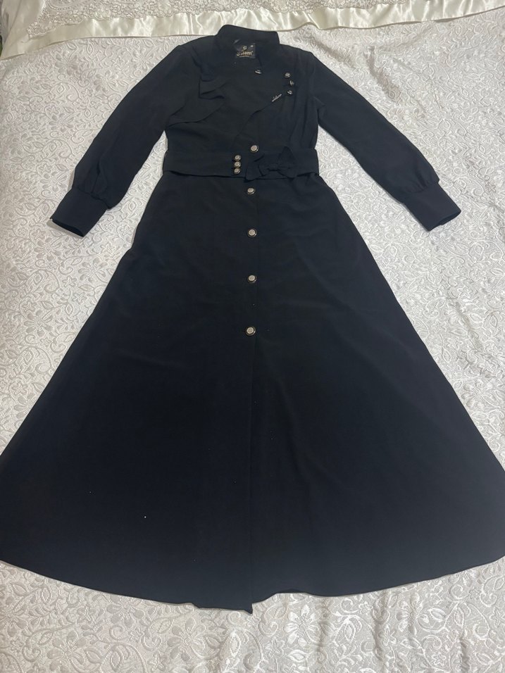 Düğmeli ve yakalı, uzun kollu ferace. Işıktan dolayı açık çıkmış koyu siyah renk. Çok güzel şık bir ferace. Boydan.