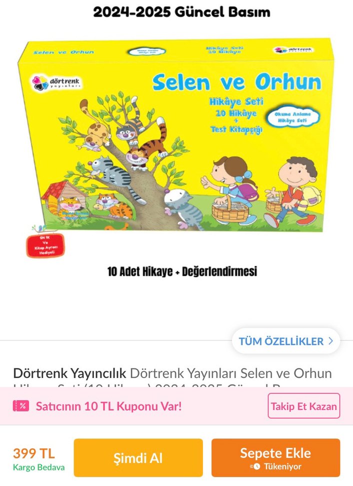 Selen ve Orhun hikaye seti, 10 çocuk kitabı ve test kitapçıklarından oluşmaktadır. 1. Sınıflar içindir. Test kitapçığı yoktur.