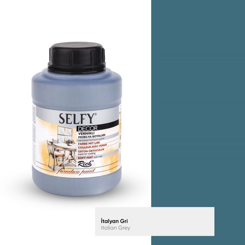 Selfy Decor İtalyan Gri mobilya verniği, mobilyalarda yumuşak mat bir görünüm sağlar. Dayanıklı kaplama ve şık gri renktedir.